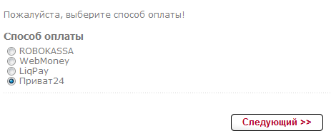1) Шаг первый. После добавления товара/товаров в корзину нажмите на кнопку "Оформить заказ". Перед Вами появится меню выбора способов оплаты (в самом низу страницы). Поставьте галочку напротив пункта Приват24. Нажмите на кнопку перехода к следующему шагу.